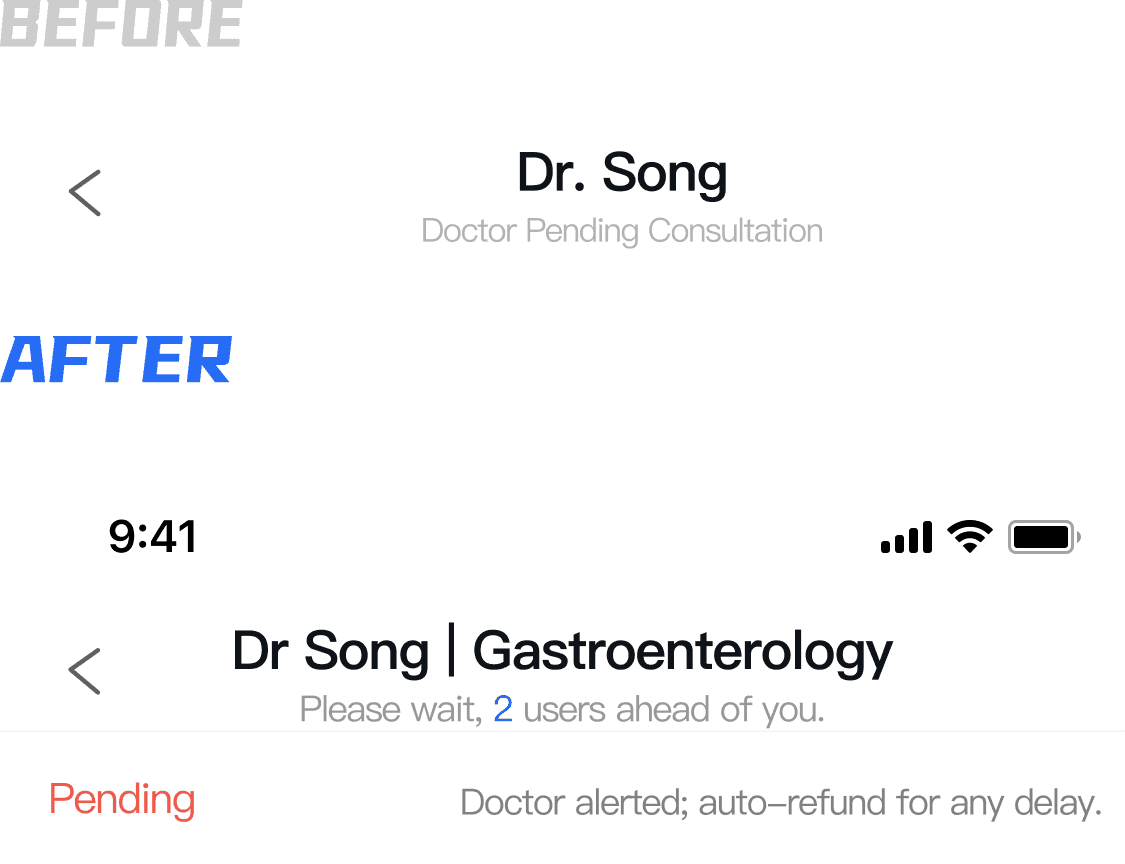 When the doctor is pending, the system displays the number of users ahead, providing clear information on the wait time.